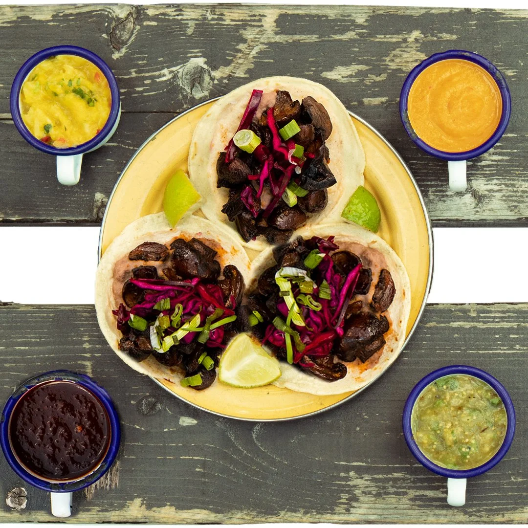 Chilimarinert aromasopp servert på hjemmelaget maistortillas, bønnepuré, toppes med syltet rødkål, vårløk og lime. To salsaer og 100% maischips medfølger.